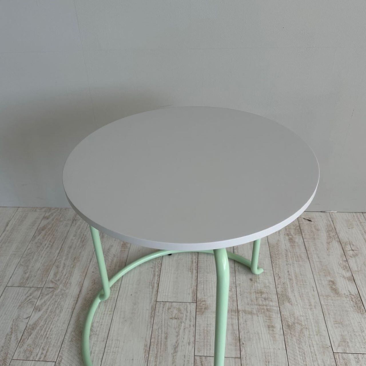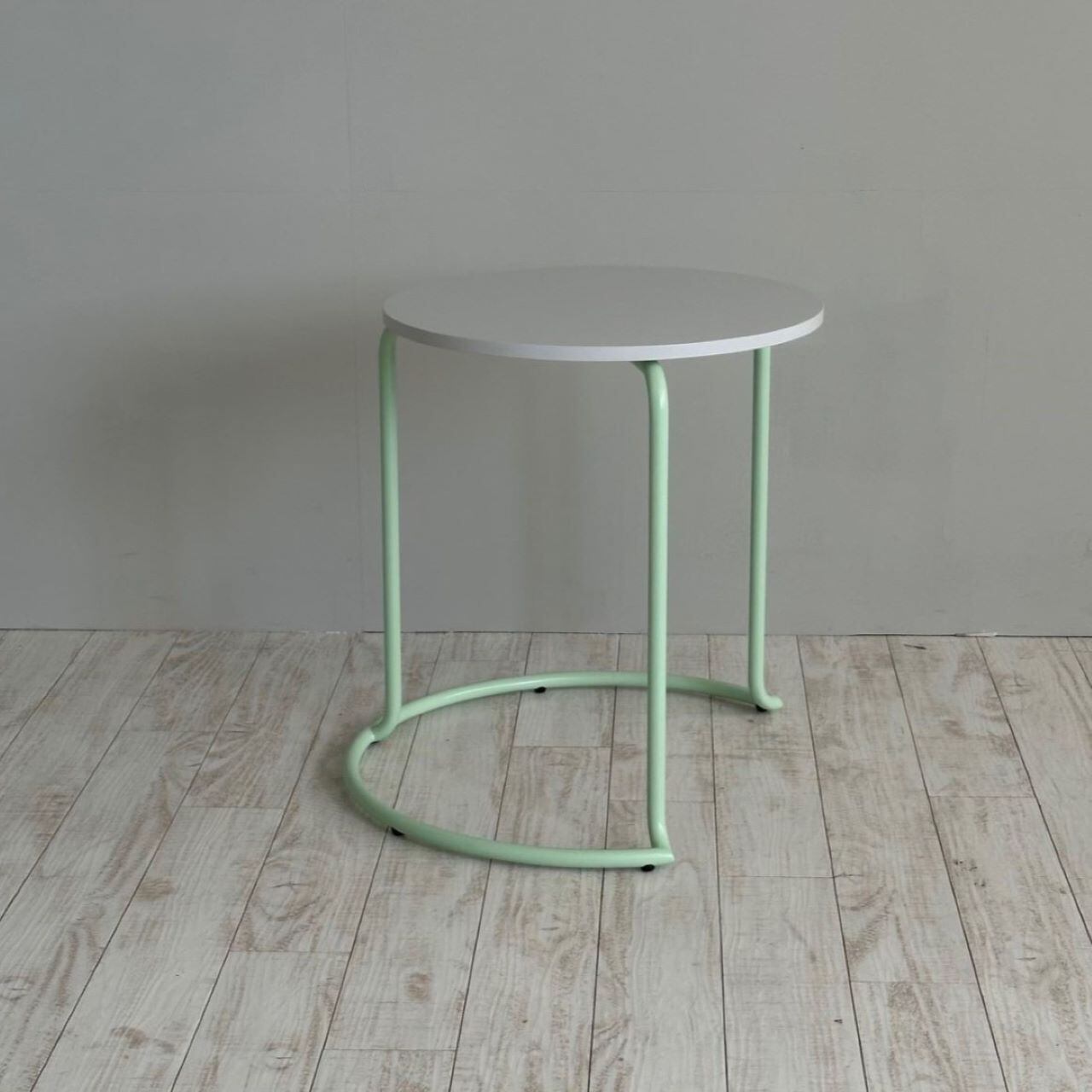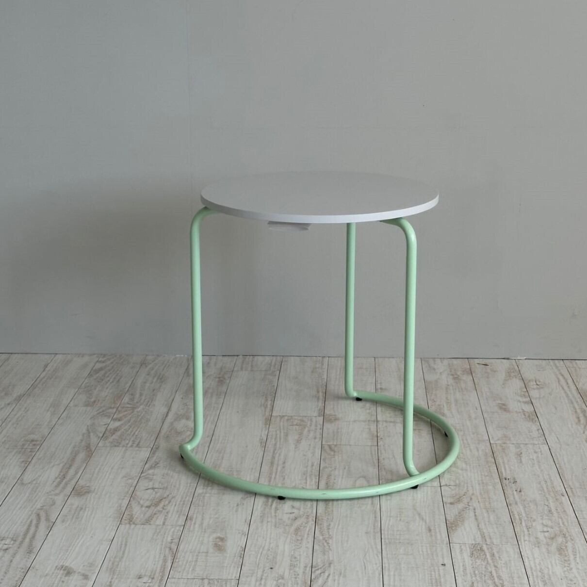 「606 サイドテーブル パイミオ」は、スチールチューブにパイミオサナトリウムの病室や天井のカラーであるミントを使い、淡いグレーの天板を合わせた限定モデルです。
