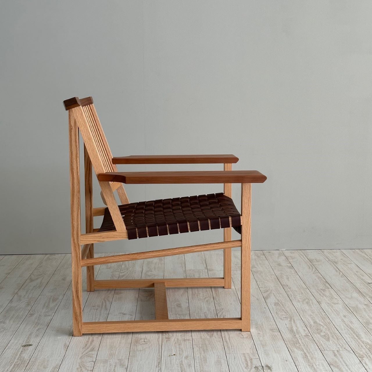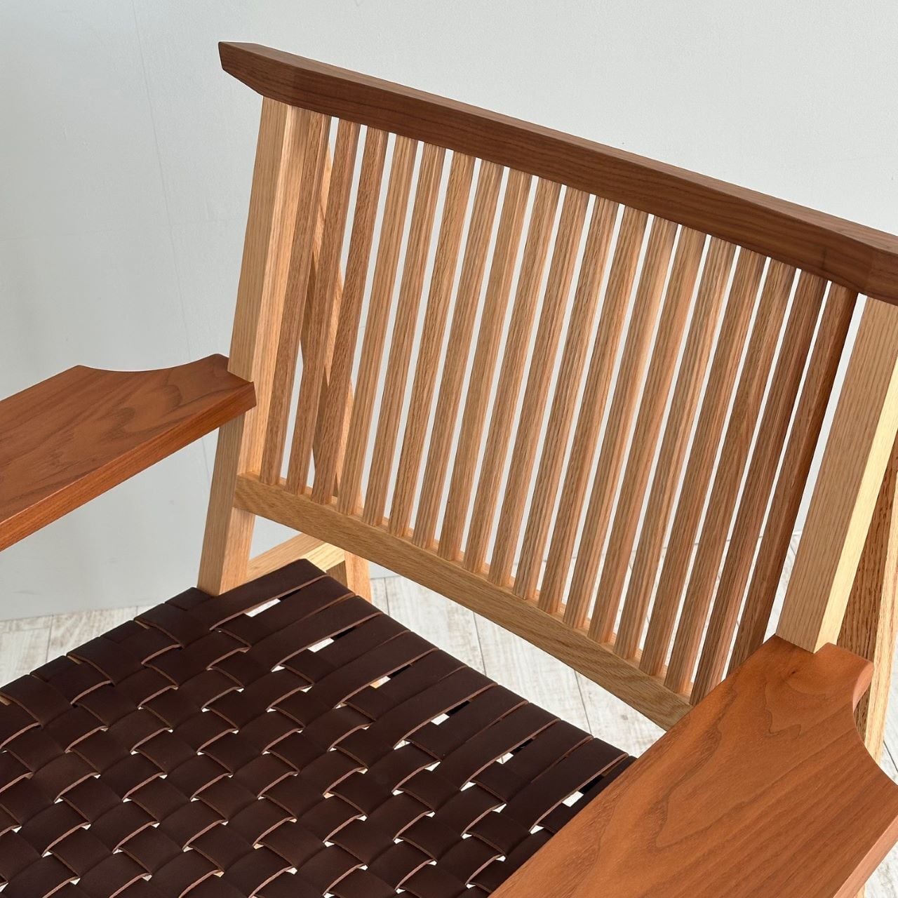 座面には心地よくしなるレザーテープを施し、背もたれや脚部などにウォルナットとオークがコントラストよく配されています。