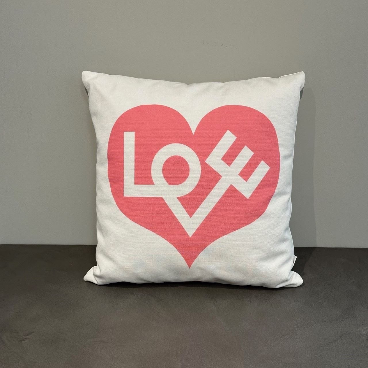 白の背景に色鮮やかなハートとLOVEのタイポグラフィーが明るく楽しいクッションです。